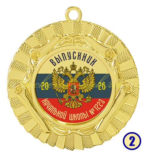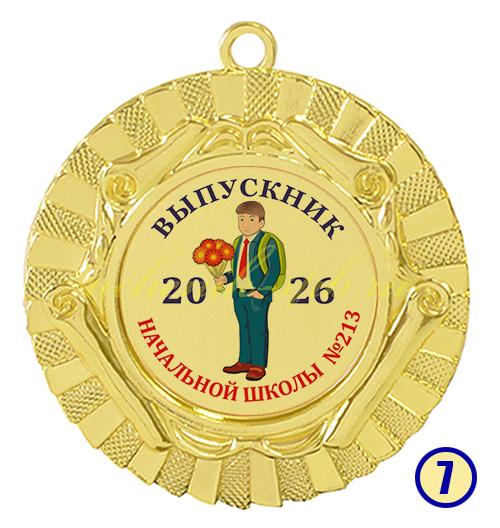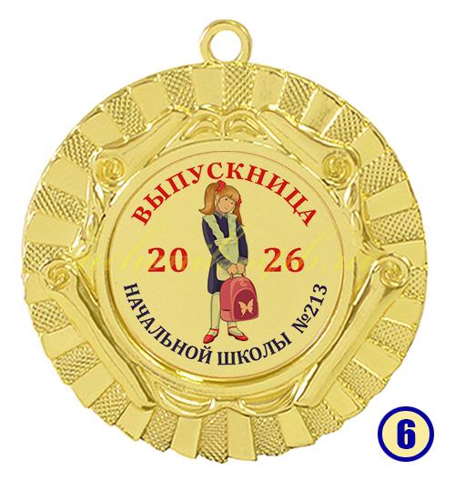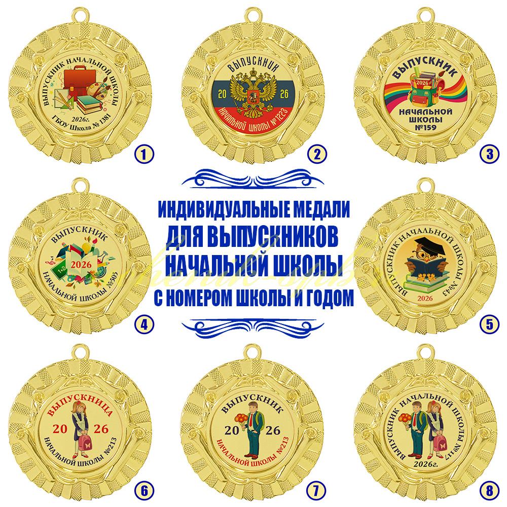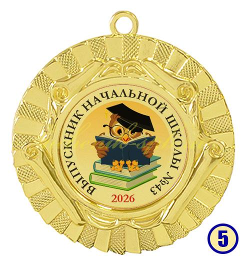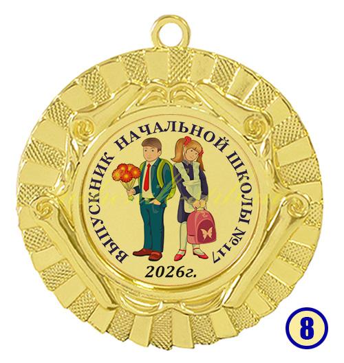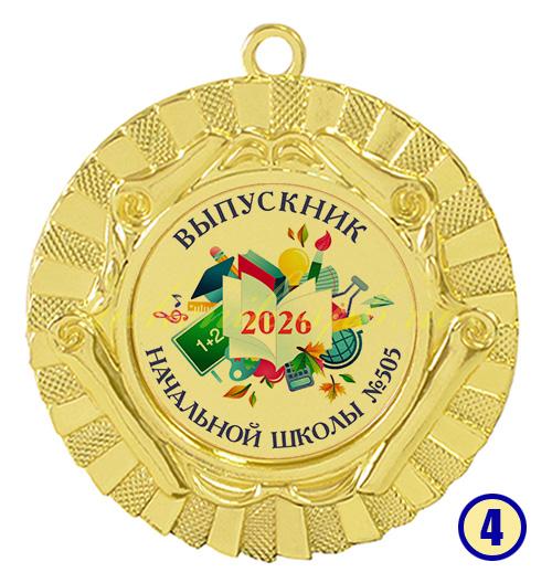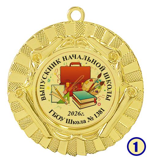Индивидуальная медаль "Выпускник начальной школы" изготовлена из металла с золотым напылением, в центре - цветная гравировка на выбор.