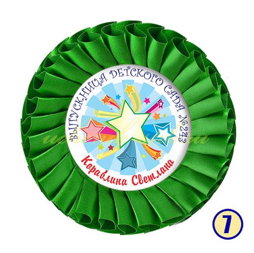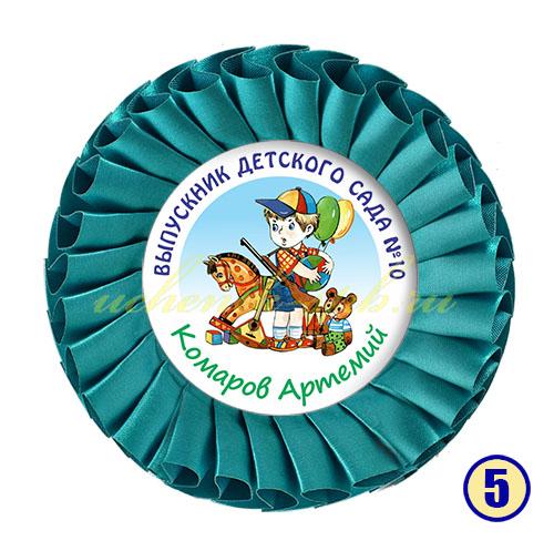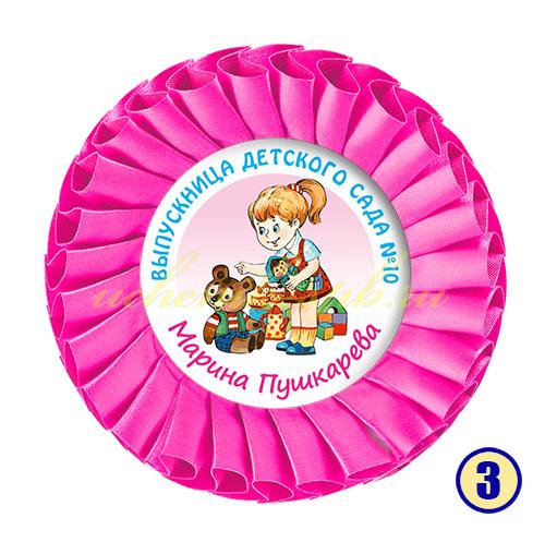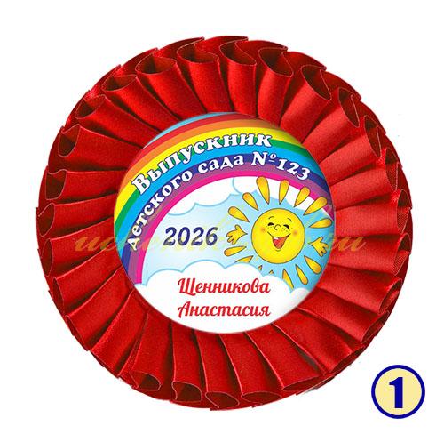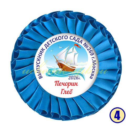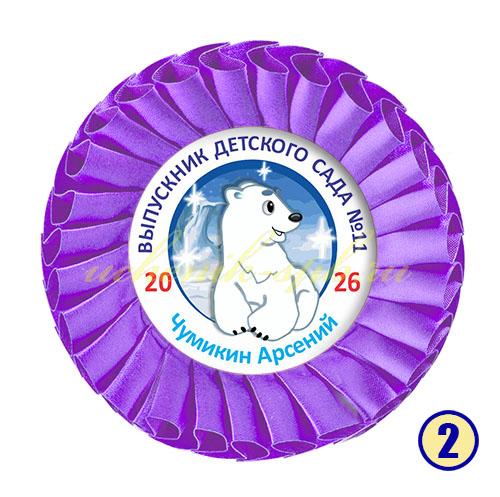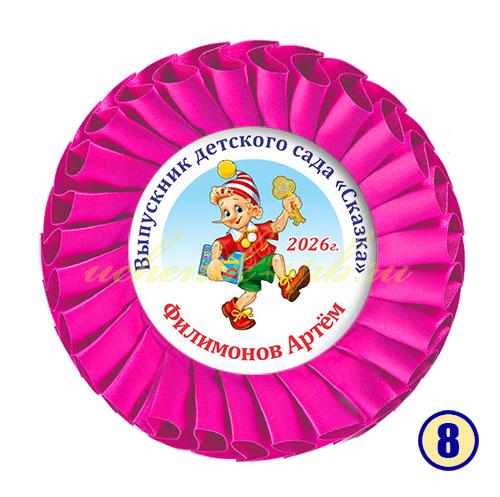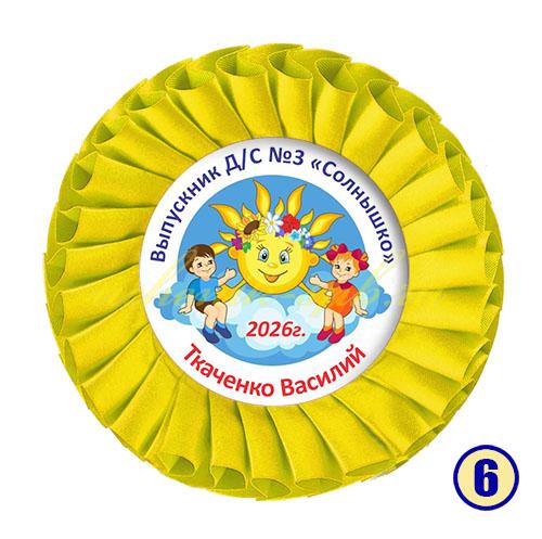 Изготовлен из атласной ленты, серединка - из металла и прочного пластика с яркой картинкой. На обороте булавка с удобным креплением.
