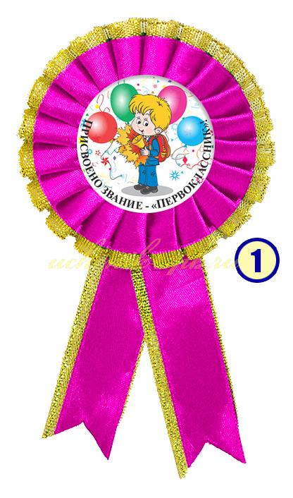 Значок-розетка из атласной ленты "Присвоено звание Первоклассник"